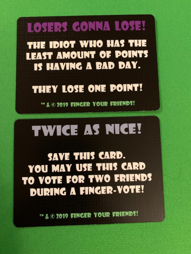 Finger Your Friends!® includes a few cards that may enhance your chances of earning points and other cards that will ruin your day!