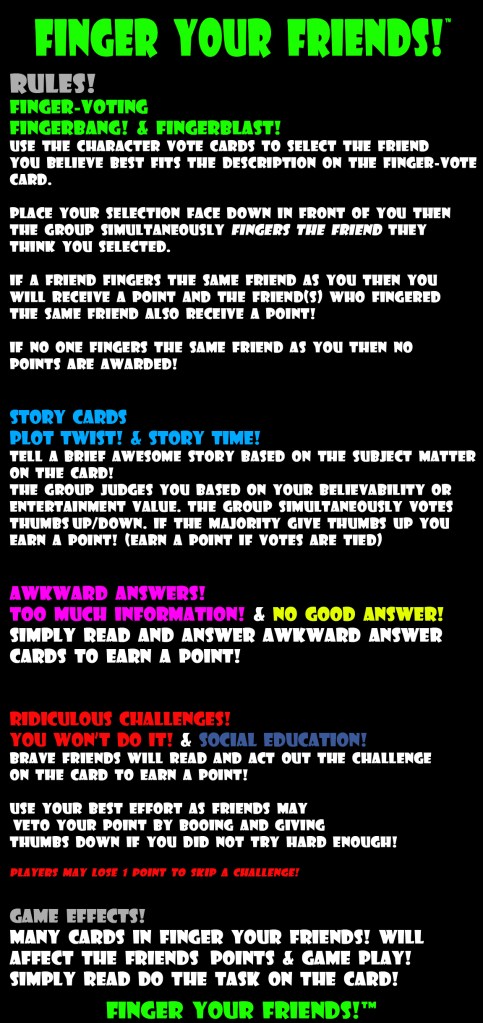 My goal for Finger Your Friends! was to never be tied to one set of boring rules or to be forced to make infinite one word cards as expansion filler.
